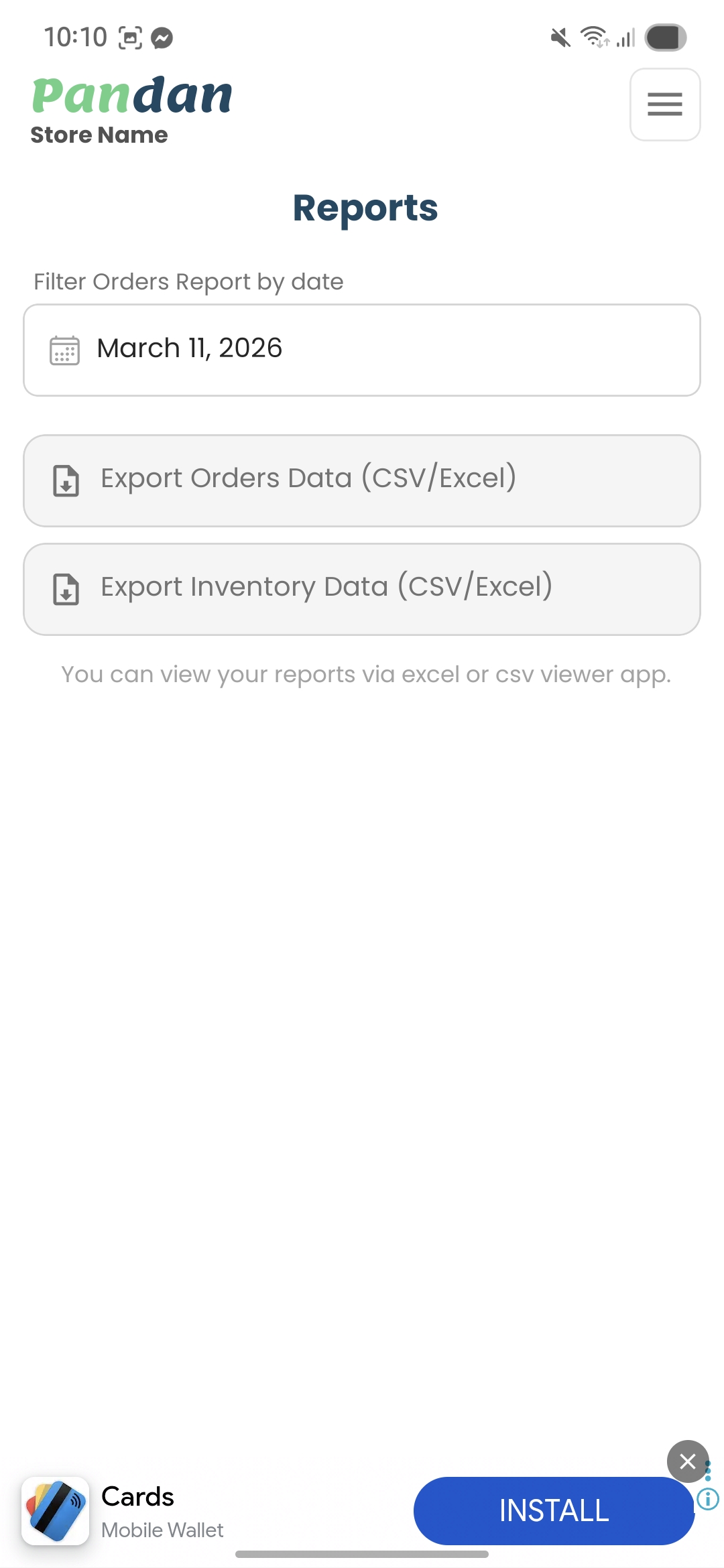 | Walang lumalabas na data sa export | Siguraduhing may orders sa napiling petsa. Kung Inventory, siguraduhing may products. |